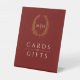 Hand-drawn leaves gold and red burgundy background wedding cards and gifts signage. Personalise with your own monogram initials. Ideal to inform gifts wear to leave their cards and gifts. Other matching items are available. Original art by Sarah Trett exclusively for www.mylittleedenweddings.com on Zazzle.