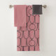 This towel set has an art deco design of pink ovals, rectangles, and circles in grey horizontal lines repeating in rows.