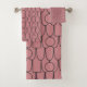 This towel set has an art deco design of pink ovals, rectangles, and circles in grey horizontal lines repeating in rows.