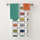 This towel set has a bath towel with a mid-century modern design of repeating rectangles and ovals in retro colours, an orange washcloth, and a turquoise hand towel.