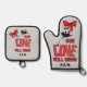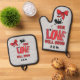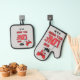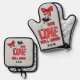 Add a touch of love and charm to your kitchen with this adorable potholder and oven mitt set! Featuring a retro-inspired design, the set includes a cupid design and the word “LOVE” crafted in bold, patterned letters. The colour palette of red, white, and grey creates a classic yet stylish look, while the finishing touch is a delicate croquette bow that adds a hint of vintage elegance. Perfect for Valentine’s Day, weddings, anniversaries, or any time you want to celebrate the warmth of love in your home. Made with high-quality heat-resistant materials, durable and easy to clean, retro design with vibrant colours and detailed patterns. Perfect for gifting to newlyweds, couples, home chefs. Customisable with letters or name.