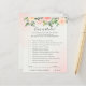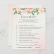 This baby shower game card features beautiful soft pastel watercolor roses and peonies in shades of blush pink and peach with lush green botanical leaves and eucalyptus.