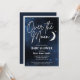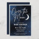 Over the moon baby shower party invitations in navy blue, white, and silver colours. Baby shower for a mother expecting a baby boy or girl. Celestial-themed party supplies with a moon and stars on a galaxy background.