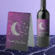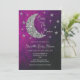 Over the moon baby shower with silver moon and stars against a black and pink purple night sky background