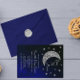 Over the moon baby shower with silver moon and stars against a black and blue night sky background