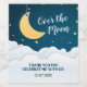 A crescent moon is tied up with string against a night sky above fluffy white clouds. Golden stars pepper the background of the cobalt night sky to thank guests for coming to an over the moon baby shower. Unisex and versatile for any baby celebration whether it is a baby shower, baby sprinkle, or sip and see. Available with matching products.