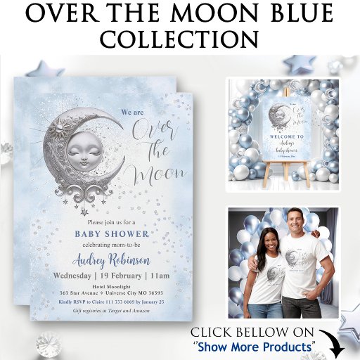 Over The Moon Blue Boy Baby Shower Invitation