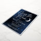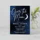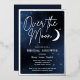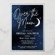 Over the moon bridal shower party invitations in navy blue with real silver foil. Celestial-themed party supplies with a moon and stars on a galaxy background to celebrate the soon-to-be bride and Mrs.