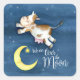 Cow jumping over the moon watercolor art welcome new baby or baby showering stickers. Cute whimsical cow jumping over the moon watercolor painting in shades of white, brown, yellow and dark black blue. © Original painting and design by Sarah Trett for www.mylittleeden.com