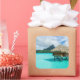 Souvenir photo sticker of an over-water thatched roof honeymoon bungalow in a resort in the clear turquoise lagoon of the tropical island Bora Bora with view on Mt. Otemanu near Tahiti in French Polynesia.