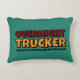 Fun pillow for overnight truckers / drivers. The word 'overnight' is in a dark red / maroon colour with a black outline and a black drop shadow, below that is the word 'trucker' in a yellow / orange colour also with a black outline and black drop shadow. Beneath that are the words 'I brake for coffee and nothing else' in black lettering.