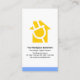 An upper yellow layer is accentuated by an oversize white bulb with your job title "electrician" at the top. Change the caption remarks to the job title to suit your own needs. Near the white base layer lies your prestigious name in blue, a slogan caption to publicise your services and the contact details. A blue stripe outlines the outer rims of the card.