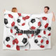 This fun soccer themed fleece blanket can be personalised with the athlete's name atop the image of a bunch of varied size red, black and white soccer balls - by katz_d_zynes