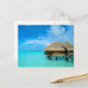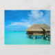 Postcard of an overwater honeymoon bungalow with a thatched roof in the turquoise blue lagoon of the tropical island of Bora Bora, near Tahiti in French Polynesia.