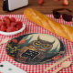 Paper plates with a cool looking owl with a piercing stare. A full moon in the back with a garden of red flowers.