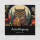 Business cards with a cool looking owl with a piercing stare. A full moon in the back with a garden of red flowers.