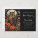 Wedding invitation with a cool looking owl with a piercing stare. A full moon in the back with red flowers.