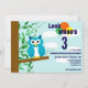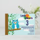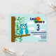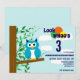 Look whoo's having a birthday! Fun blue owl in a woodland scene with blue sky and fluffy clouds