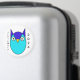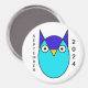 Imagine a small, round magnet with a clean white background. In the centre sits a vibrant blue owl, its feathers rich with varying shades of blue, from deep cobalt to lighter sky blue. The owl has large, piercing eyes giving it an alert and wise expression. Its wings are tucked neatly to its sides, while small details like white speckles or lighter blue accents decorate its body, adding texture. The owl's beak is sharp and pointed, possibly a contrasting colour like orange or black, standing out against the cool blues. Its feet are small, resting gently on the white surface of the magnet. The overall design is simple yet striking, with the contrast between the blue owl and the white background creating a charming and eye-catching visual.
