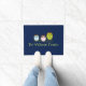 Cute door mat done in dark blue, with cartoon graphics of three owls on a branch. Personalise the fun green text to read what you want.