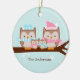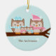 Customisable Christmas ornaments featuring an adorable family of owls perched on a tree branch in soft pastel colours.