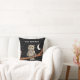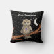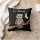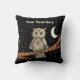 This throw pillow has a brown owl sitting on a tree branch with golden yellow eyes wearing a purple crystal necklace with a white crescent moon and stars on a black background. Customise your text with the template on the front and back.