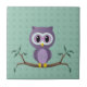 White Ceramic Tile has a cute purple cartoon owl on a limb with a green polka dot pattern background. Customisable.