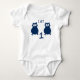 Two blue owls on a white baby suit for the baby's first birthday. I am one.