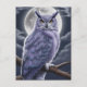 A majestic owl with striking blue-grey feathers perches on a branch under a full moon, its piercing yellow eyes gazing intensely.