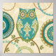 © Veronique Charron / Wild Apple. A patterned image of an owl with circular patterns. There is also a tan coloured floral background in the image.