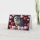 This Valentine's Day card shows a baby owl perched in a basket and surrounded by pink and red fuzzy hearts. The words inside the card say, "WHO loves you? I do. Happy Valentine's Day."