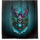 Owl with magical elements. The design features an impressive, stylised owl with its wings spread wide, designed in a vibrant colour palette of purple, blue and white. The owl exudes a majestic presence, while its piercing yellow eyes look directly at the viewer, creating a sense of intensity and mystery. Intricate, swirling patterns unfold around the owl, reminiscent of magical symbols, giving the overall image a mystical aura.