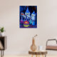 Owl Wizards Magic alchemy, whimsical, funny poster. "The Owl Chemists", an alchemist wizard owl and young student combine elements to create new magic. Poster from the original fantasy art painting by Sue Halstenberg.