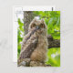 A fledgling owlet is perched on a maple tree limb and staring at the camera.
