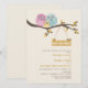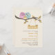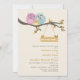 A gender reveal party invitation featuring an illustration of a mummy and daddy owl sitting on a tree branch with an orange baby owl between them. Tree branch has autumn leaves.