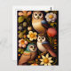 Postcard features whimsical owls and flowers in a modern Haeckel style. Botanical digital art created with AI generating software.
