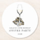 Personalized Oyster Pearl Party themed paper coasters for your next Oyster Pearl Party or seafood event. It features a watercolor styled illustration of wine and oysters. Underneath this are spots for your own unique event information.