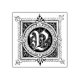 Letter P first letter vintage gothic style hand drawn calligraphy. Ornate letter P is centred in a circular frame and square outer frame. Embellished with waves, dots and decorative lines.