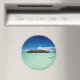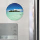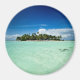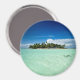 Round photo magnet of a desert or uninhabited adventure Island with palm trees and a dark blue sky in the turquoise water of a lagoon in the Pacific archipelago French Polynesia