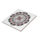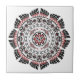 This decorative ceramic tile features mandala art in the style of Pacific Northwest Native American art using fairly typical colours of black, white, grey, and red. The four elements are represented. The sun symbol in the centre represents fire and symbolises life and abundance. The salmon represent water and symbolise fertility, prosperity, and renewal. The bears represent earth and symbolise strength, family, and vitality. The eagle feathers represent air and symbolise leadership, focus, and peace. There is also a ring of sweetgrass which is common throughout the region.