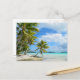 Hanging palm tree on a white sand beach on a small desert island in the blue lagoon of tropical Rangiroa, an atoll of the Tahiti archipelago French Polynesia in the Pacific ocean.