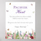 This pacifier hunt baby shower game sign features an elegant and pretty garden of watercolor pink and purple flowers including tulips, lavender, roses and eucalyptus greenery with bright coloured butterflies and bumble bees flying around.