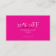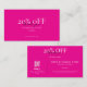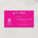A modern discount business card designed for small business owners. Includes space for a thank you message, QR code, social media details, and branding information, making it perfect for packaging inserts and order thank you cards. A clean and customisable design that helps strengthen customer relationships, support repeat purchases, and create a bold branded presentation in hot pink.