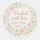 A soft, elegant round sticker with blush pink watercolor flowers and green foliage. Features the message "Packed with love, just for you" in a classy serif and script font. Perfect for small businesses, thank-you packaging, and special gift wrapping.