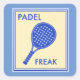 A graphic design featuring a padel racket dominates the centre, with the words ""PADEL FREAK"" prominently displayed below it. The design uses a two-tone colour scheme with a light yellow background and blue for the elements and border of the design.