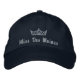 Shown in Navy with a embroidered stitch of silver and a silver crown. This cap has front text only. Adjustable back.