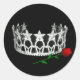 Round sticker shown in black with a photo print of a pageant queens crown and a red rose. Customise this item or buy as is.