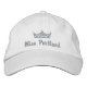 Shown in White with a embroidered stitch blue text and of golden cornsilk isacord crown. This cap has front text only. Adjustable back.