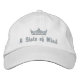Shown in White with a embroidered stitch blue text and of golden cornsilk isacord crown. This cap has front text only. Adjustable back.