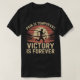This black t-shirt features the motivational text "PAIN IS TEMPORARY, VICTORY IS FOREVER" in a bold, slightly distressed white and red font arranged around a central graphic. The graphic shows a silhouette of a runner, who appears to be a light-skinned individual, crossing a finish line tape in a stadium setting against a backdrop of red and beige stripes.
